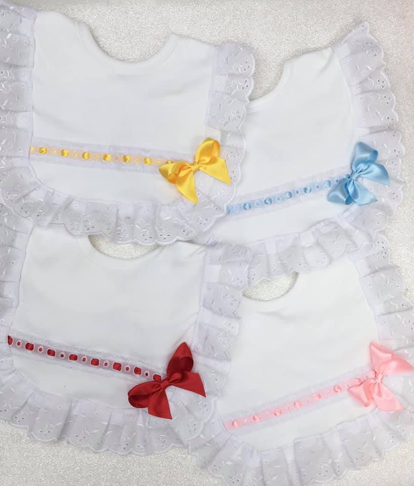 Baby's Frilly Broderie Anglaise Bib with Ribbon Slot Trim and Bow